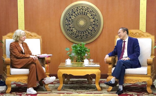 Thứ trưởng Bộ NN-MT Phùng Đức Tiến đã có buổi tiếp và làm việc với bà Christine Middlemiss, Trưởng Cơ quan Thú y (CVO), Bộ Môi trường, Thực phẩm và Các vấn đề nông thôn Vương quốc Anh và Bắc Ireland. Ảnh: Phương Linh.